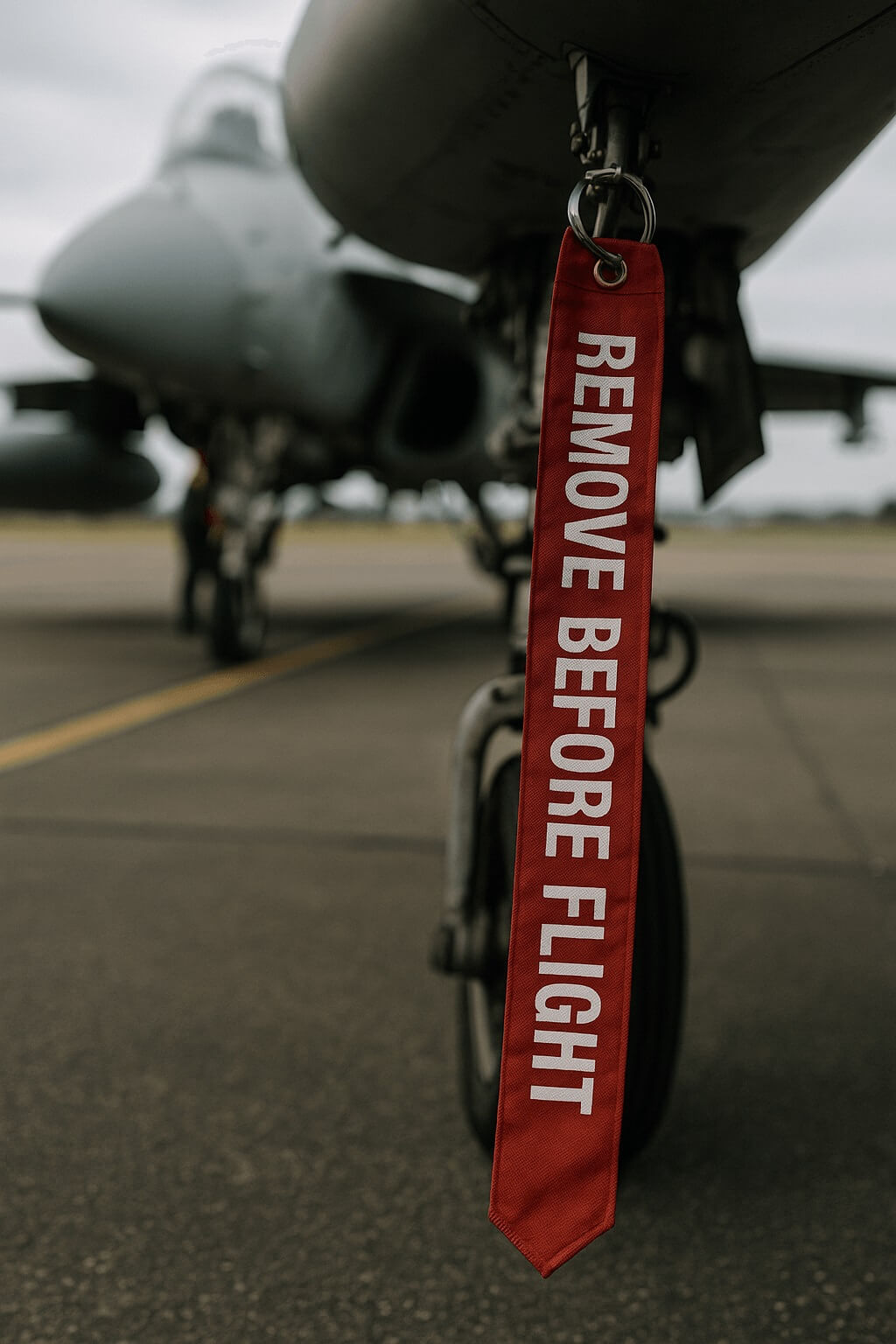 Na mnohých bomber bundách, najmä na ikonických modeloch MA-1, nájdete na rukáve pripevnenú červenú stuhu s bielym nápisom „Remove Before Flight“. Tento detail nevznikol len ako módny doplnok, ale má svoj pôvod v letectve.