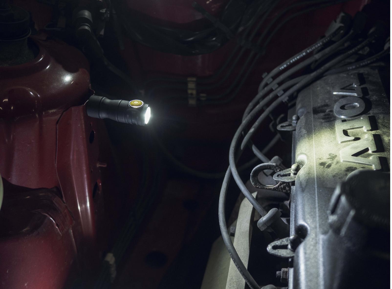 Tratamentul mat special, antiaderență, oferă o priză sigură chiar și cu mâinile umede. Magnetul integrat permite fixarea pe suprafețe metalice, ceea ce este extrem de practic pentru activități profesionale și situații în care aveți nevoie de lumină „hands-free”. Fasciculul alb are un punct central puternic și un flux larg, cu o rază de iluminare de până la 114 metri.