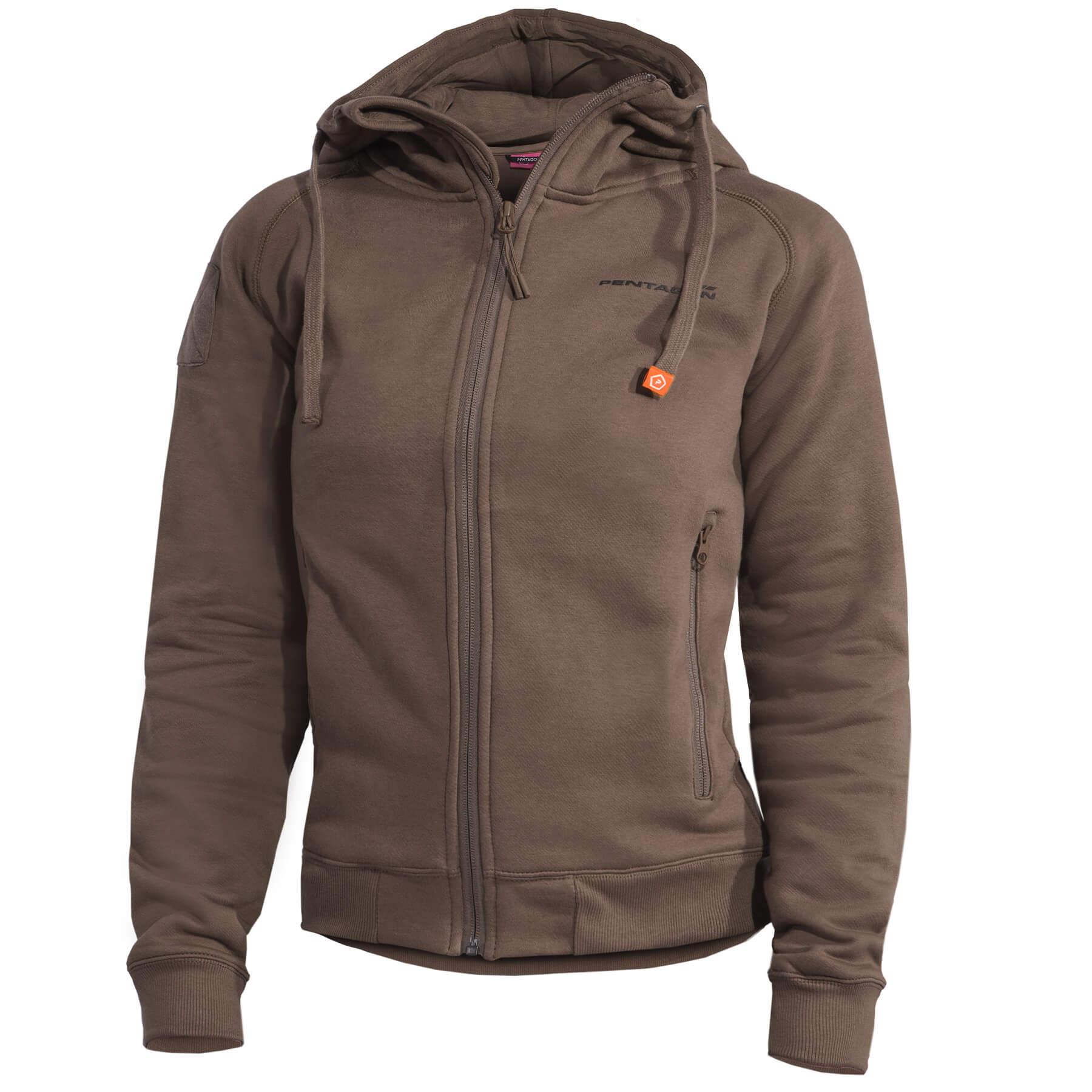Hanoracul damă Aphrodite Pentagon este ușor căptușit, are glugă ajustabilă cu ajutorul șnururilor. Partea de jos a hanoracului și mânecile sunt finisate cu manșete elastice. Pe mâneca dreaptă se află un panou velcro. Hanoracul are două buzunare laterale clasice cu fermoar.