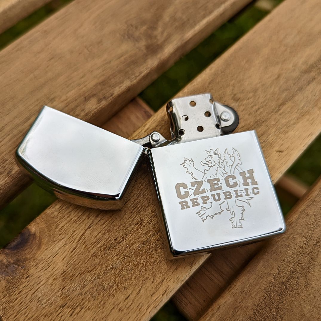 Brichetă pe benzină în finisaj cromat, cu gravură a simbolului Czech Republic.