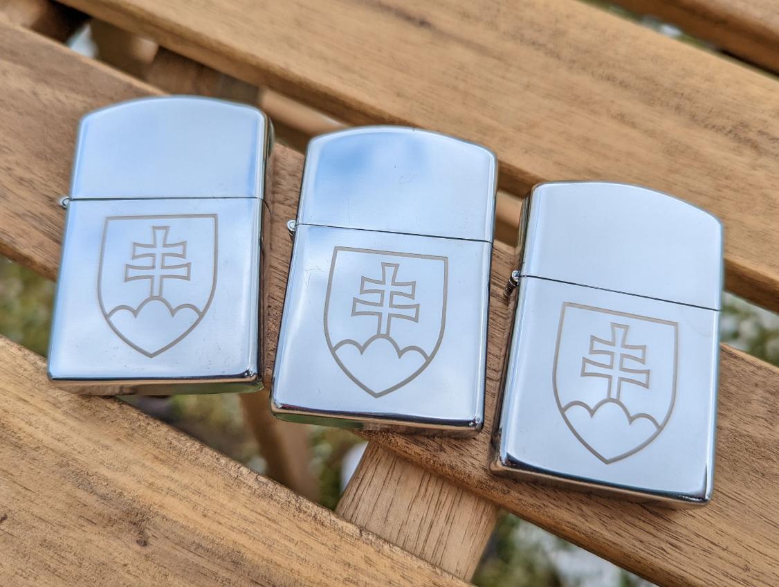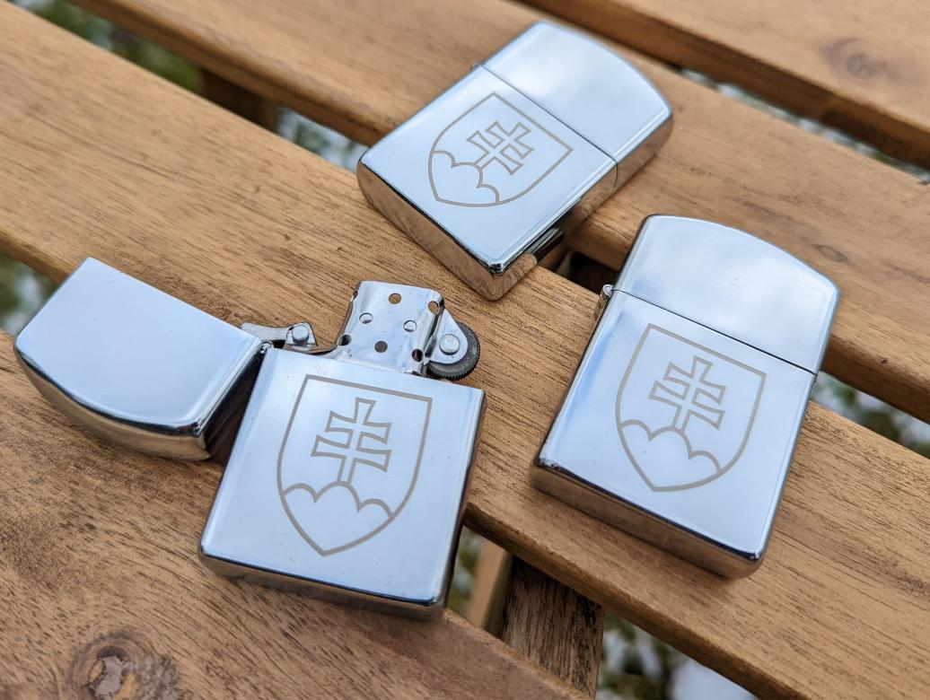 Brichetă pe benzină în finisaj cromat cu gravură a simbolului Slovac.
