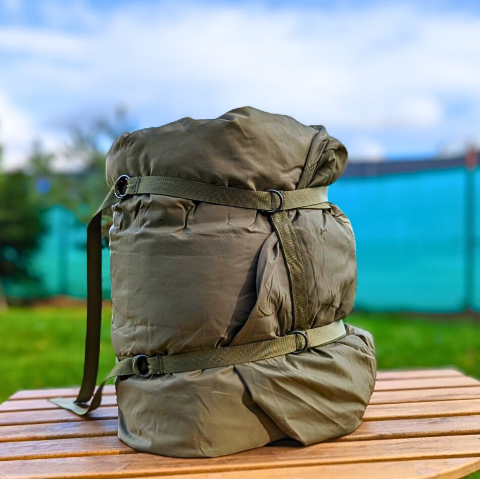 Husă: acest sac de dormit nu are husă de compresie, deoarece se rulează și se fixează cu curele care sunt parte integrantă a sacului