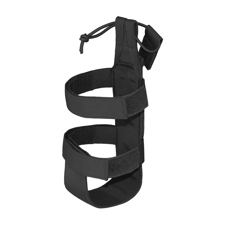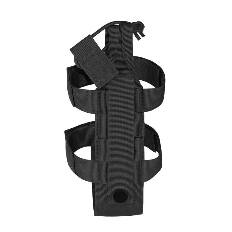 Suport practic pentru sticlă, compatibil cu sistemul MOLLE, ideal pentru călătorii, camping, drumeții, activități de tip survival sau chiar pentru utilizarea zilnică. Sticla este fixată în siguranță prin două chingi reglabile cu Velcro, iar gura acesteia este asigurată cu un șnur elastic.