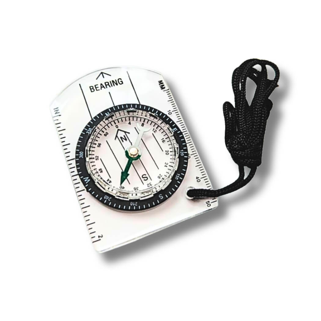 O busolă simplă dintr-o bucată de plastic, care vă va ajuta la orientarea de bază cu harta.