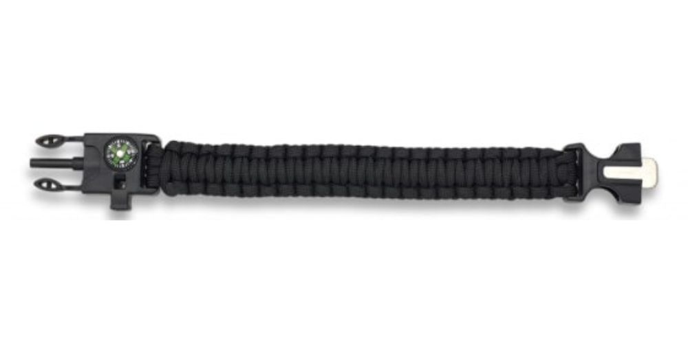 Brățară paracord cu fluier, amnar și busolă. Amnarul este pe o parte a clemei, iar lama cu care se freacă amnarul este pe cealaltă parte.