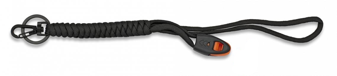 Breloc din șnur paracord împletit, cu carabinieră pentru prindere și fluier.