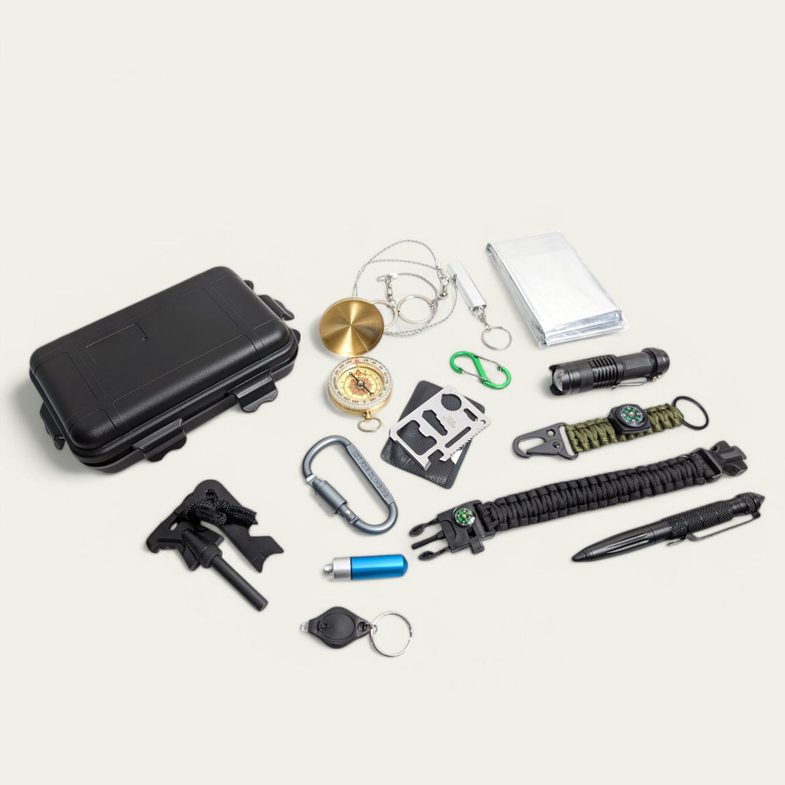Set de supraviețuire într-o cutie de plastic cu garnitură.