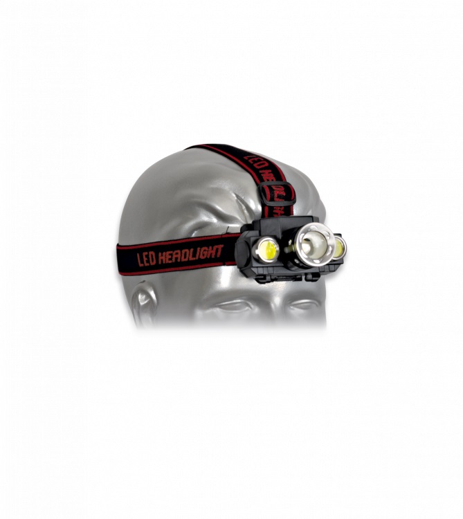 Výkonná nabíjateľná čelovka s 3 LED hlavami (1x T6 a 2x COB). Funkcia Zoom je na strednej LED.