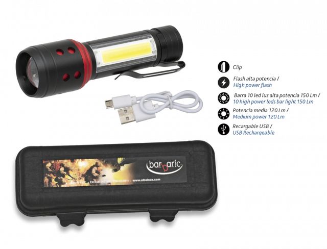 Nabíjateľná baterka prostredníctvom micro USB kábla. Obsahuje aj klip na opasok.