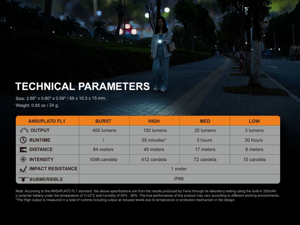 Control: prin apăsarea butonului timp de 0,5 secunde, se comută între modurile de iluminare 150 lumeni, 25 lumeni și 3 lumeni. La apăsarea butonului mai mult de 1,2 secunde, se activează modul BURST de 400 lumeni. Pentru acest mod, este necesar să țineți butonul apăsat și este destinat situațiilor în care aveți nevoie să iluminați o suprafață foarte mare și la distanță (pentru o lanternă atât de mică, este un mod foarte puternic, iar în cazul iluminării prelungite, lanterna s-ar încălzi prea rapid - tocmai de aceea modul este disponibil doar la apăsarea butonului).