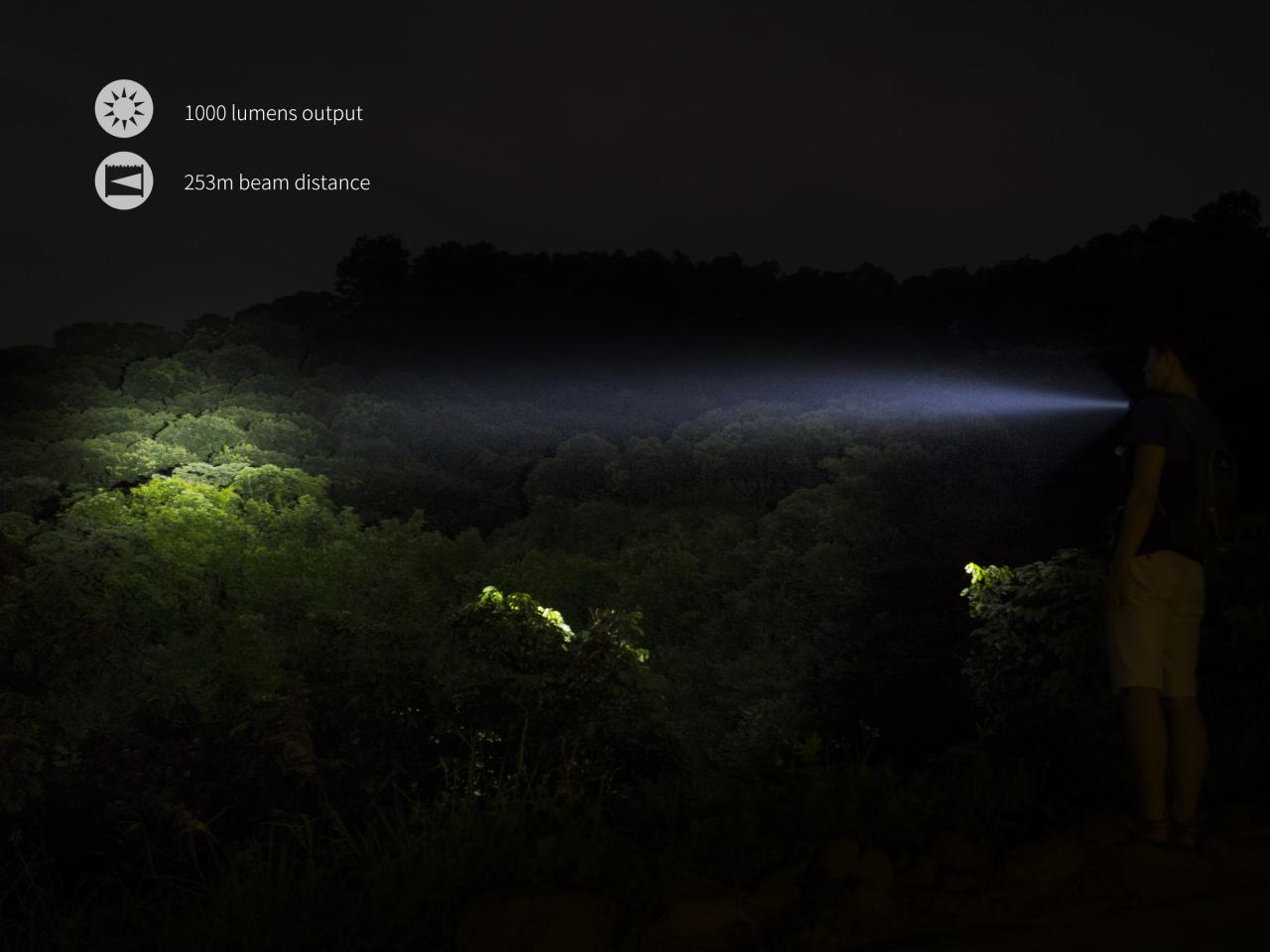 Režimy svietenia: 1000 lumenov (1,4h) / 350 lumenov (3,3h) / 150 lumenov (8,75h) / 50 lumenov (28,4h) / 5 lumen (150h) stroboskop s premenlivou frekvenciou.