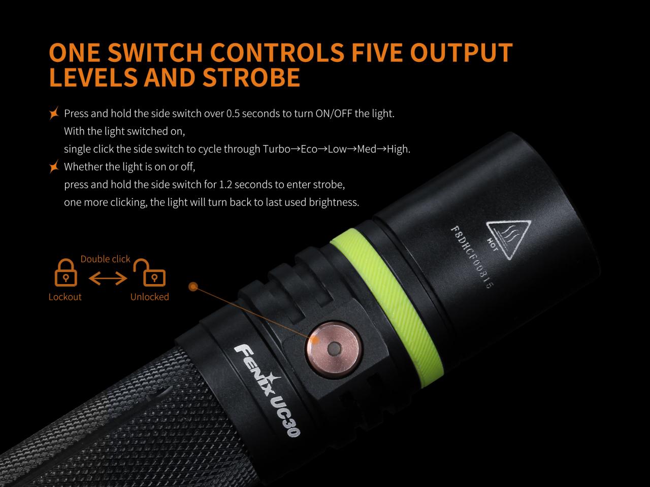 Nabíjateľné svietidlo Fenix UC30 XP-L je veľmi výkonné a zároveň rozmerovo kompaktné. Dosvit 253m a výkon 1000lm zabezpečuje, že svietidlo je vhodné pre profesionálov (SBS služba, stráženie väčších objektov), ale aj pre kutilov a v domácnosti (režimy sa dajú prepínať aj na nižší výkon).