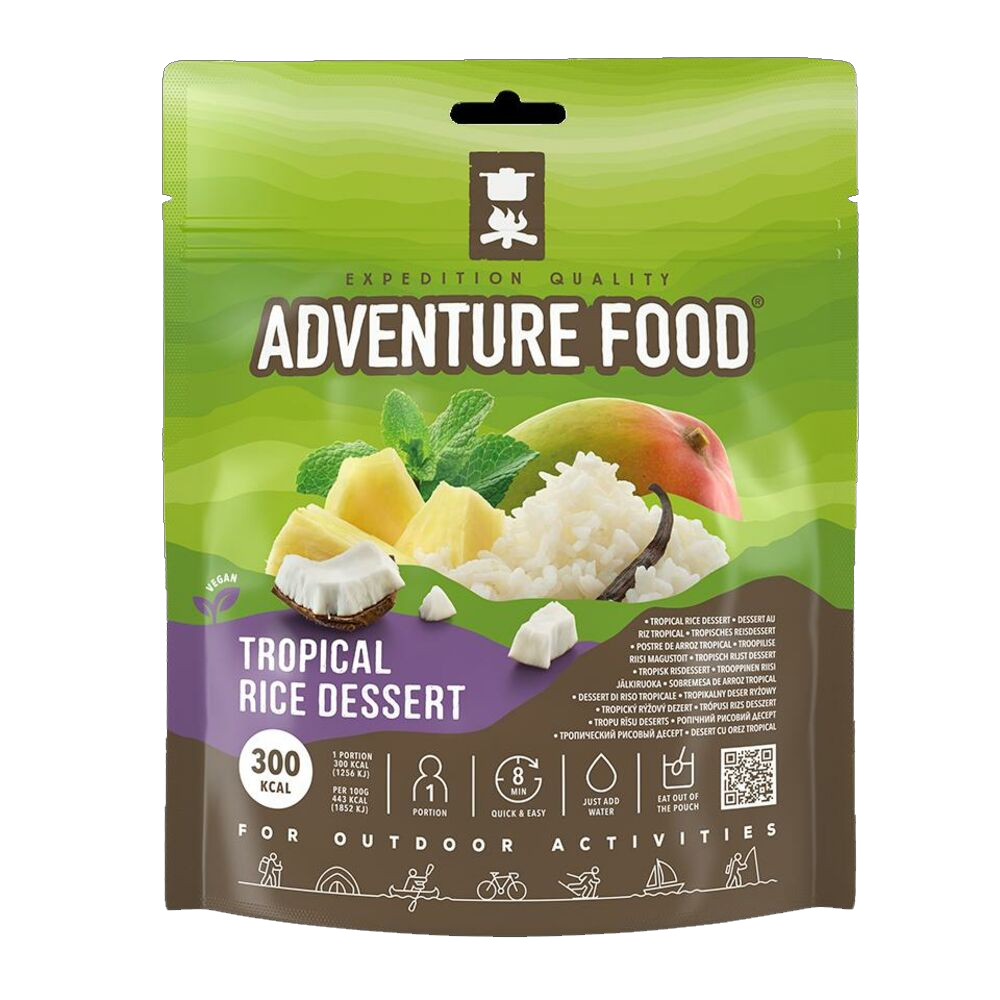 MRE (Meal Ready to Eat) pentru expediții de la producătorul olandez Adventure Food. Desert tropical cu orez, nutritiv și gustos.