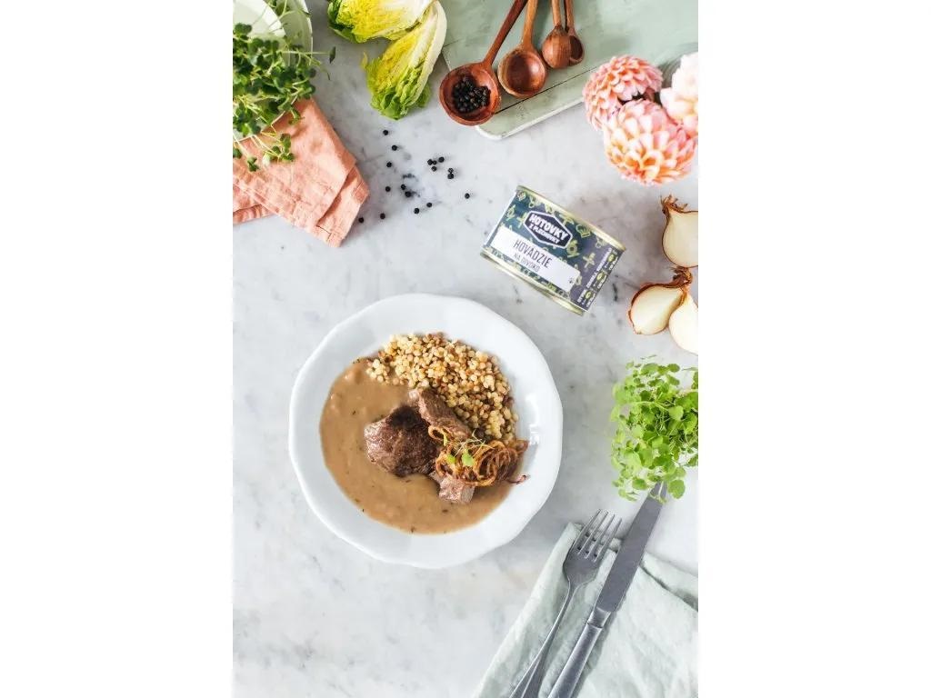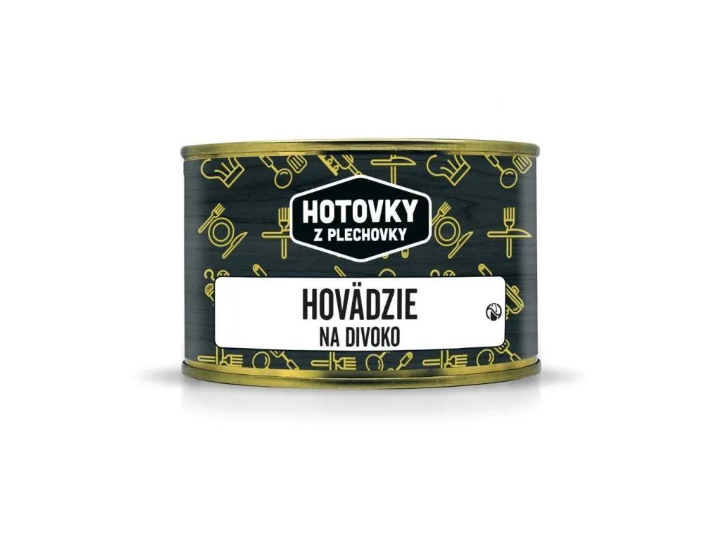 Carne de vită 400g de la producătorul Hotovky z plechovky. Alimentele au o valoare nutritivă echilibrată, prepararea lor durează doar câteva minute și se consumă direct din conservă, din farfurie sau din alt vas. Ideale pentru drumeții mai lungi, camping, pescuit, vânătoare și activități similare. În rucsac ocupă foarte puțin loc.