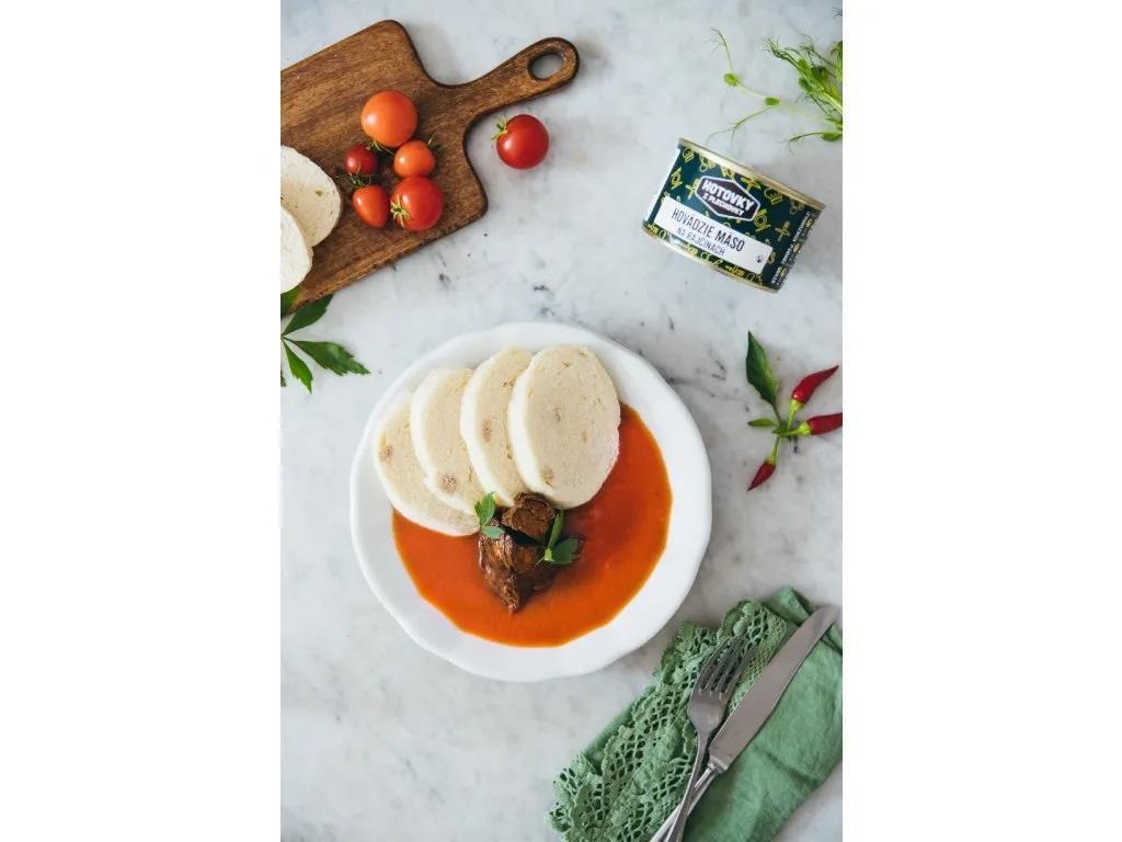 Carne de vită în sos de roșii 400g de la producătorul Hotovky z plechovky. Alimentele au o valoare nutrițională echilibrată, prepararea lor durează doar câteva minute și se consumă direct din conservă, farfurie sau alt vas. Ideal pentru drumeții mai lungi, camping, pescuit, vânătoare și activități similare. În rucsac ocupă foarte puțin spațiu.