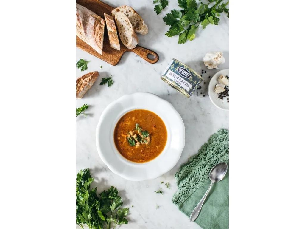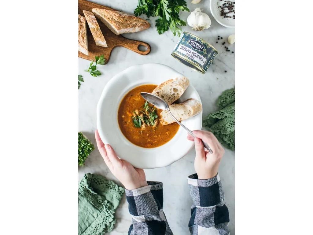 Produs cu valoare nutritivă echilibrată, gata de consum în doar câteva minute. Poate fi servit direct din conservă, farfurie sau alt vas. Ideal pentru drumeții mai lungi, camping, pescuit, vânătoare și activități similare. Ocupă foarte puțin spațiu în rucsac.