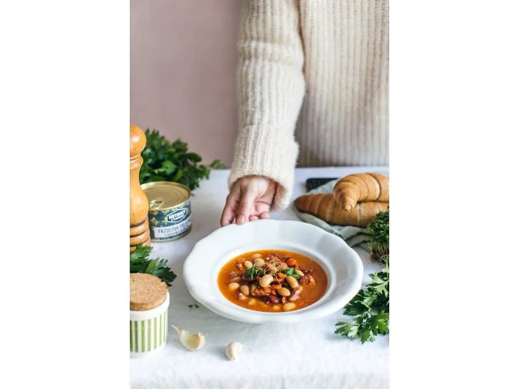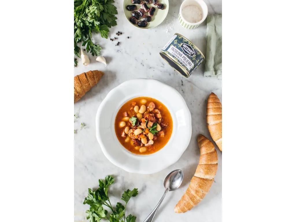 Supă de fasole cu afumătură și cârnați 400ml de la producătorul Hotovky z plechovky. Alimentele au o valoare nutritivă echilibrată, prepararea lor durează doar câteva minute și se consumă direct din conservă, farfurie sau alt vas. Acest preparat este ideal pentru drumeții mai lungi, camping, pescuit, vânătoare și activități similare. În rucsac ocupă foarte puțin spațiu.