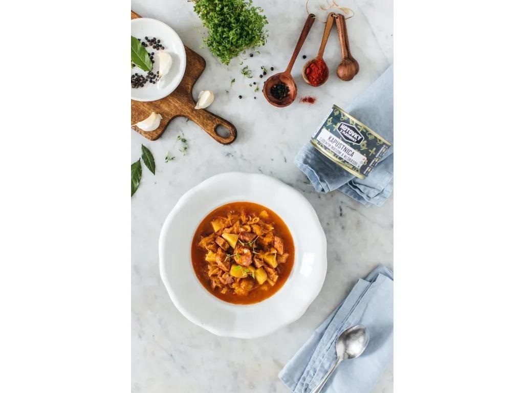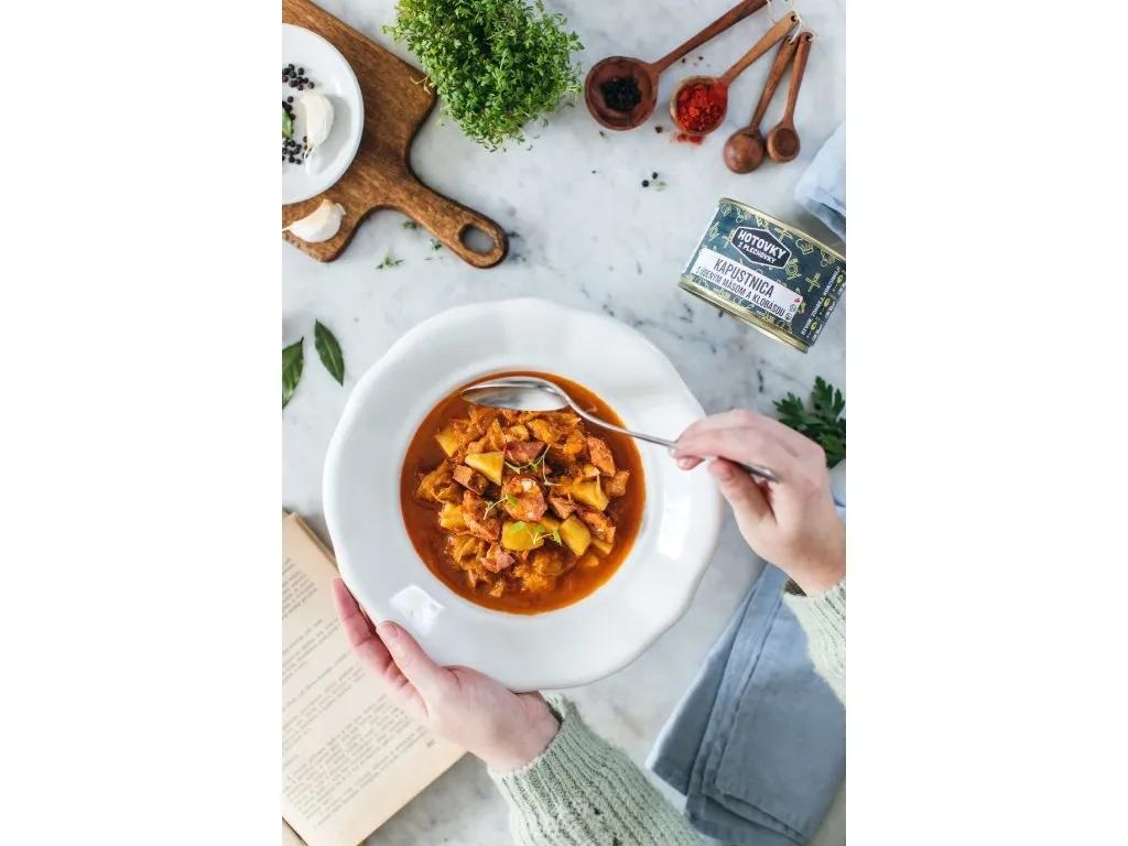 Varză cu carne afumată și cârnați 400ml de la producătorul Hotovky z plechovky. Alimentele au o valoare nutritivă echilibrată, prepararea lor durează doar câteva minute și se consumă direct din conservă, farfurie sau alt vas. Ideal pentru drumeții mai lungi, camping, pescuit, vânătoare și activități similare. În rucsac ocupă foarte puțin spațiu.