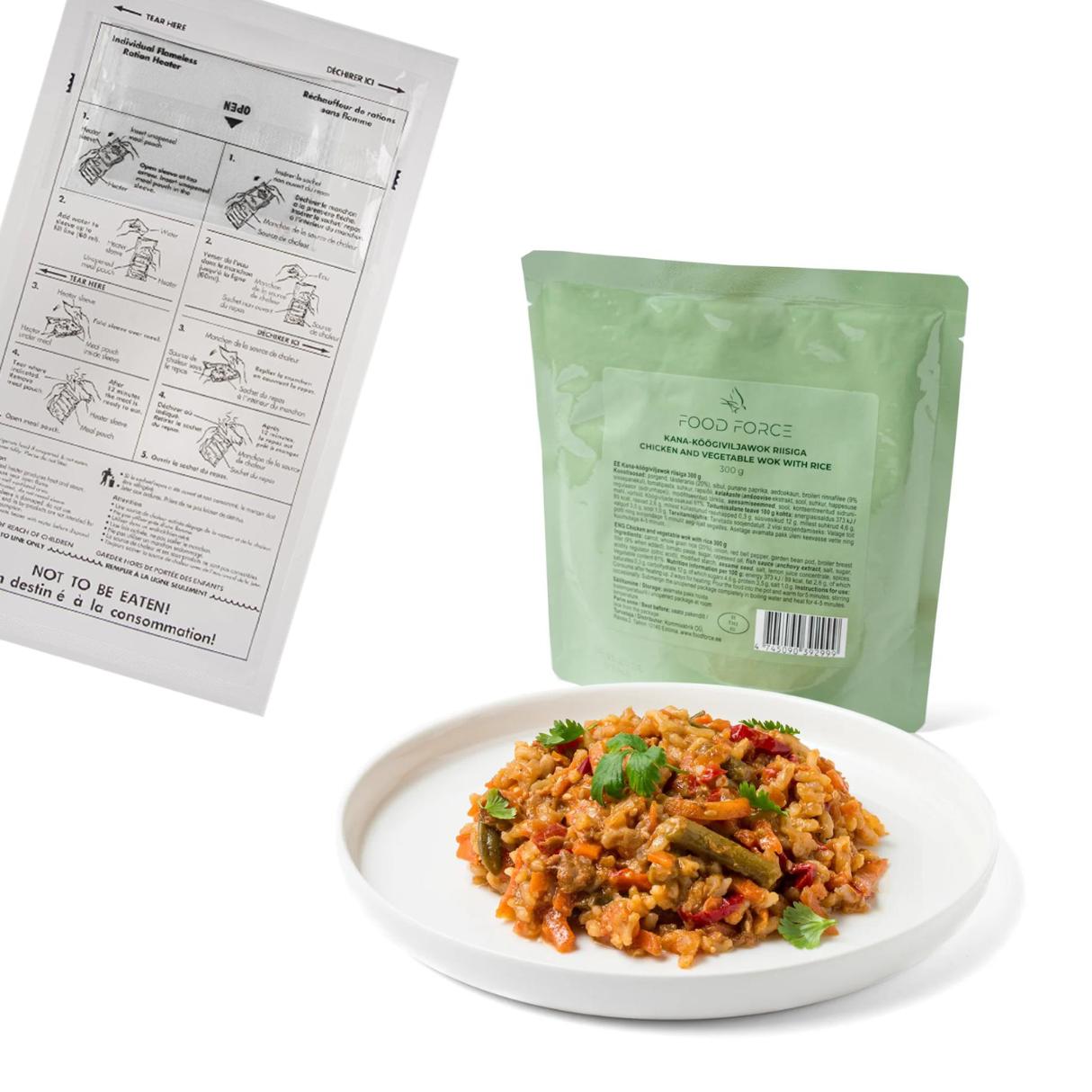 MRE (Meal Ready to Eat) pentru expediții de la producătorul estonian Food Force. O masă consistentă sub forma popularului wok de pui cu legume și orez. Mâncarea a fost creată din ingrediente atent selecționate de cea mai înaltă calitate, pentru a asigura aportul necesar de nutrienți în orice situație.