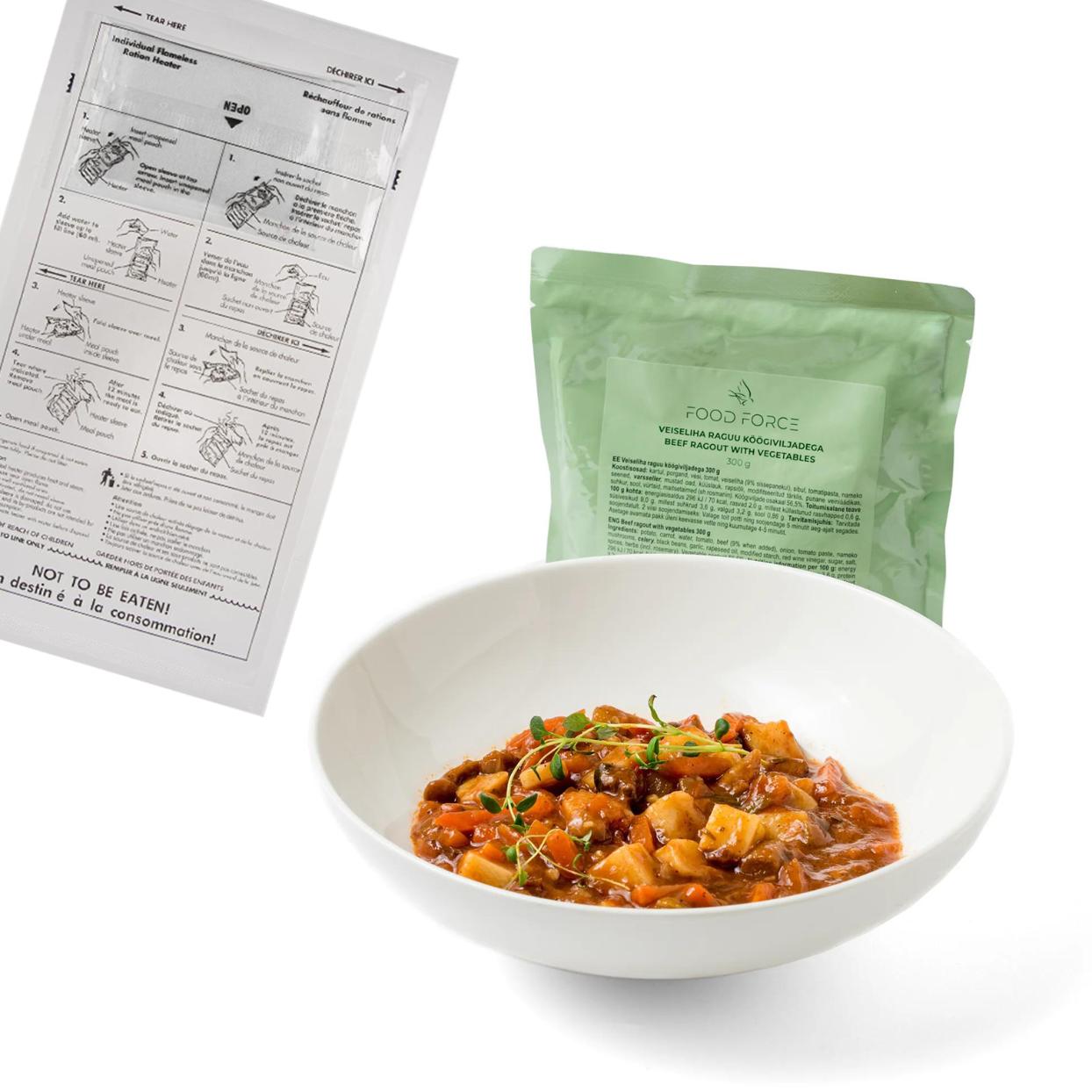 MRE (Meal Ready to Eat) pentru expediții de la producătorul estonian Food Force. O mâncare delicioasă sub formă de ragout de vită cu legume. Preparatul a fost realizat din ingrediente atent selecționate de cea mai înaltă calitate, pentru a asigura aportul necesar de nutrienți în orice situație.