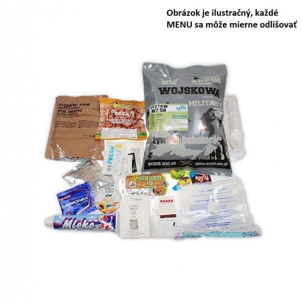 Vojenská potravinová dávka zavedená v Poľskej armáde od výrobcu ARPOL. Konkrétne tento model je zo série WSH, individuálna vojenská dávka, v ktorej je vždy jeden výdatný obed, zákusok, sucháre, cukríky a pod. s príborom a príslušenstvom.