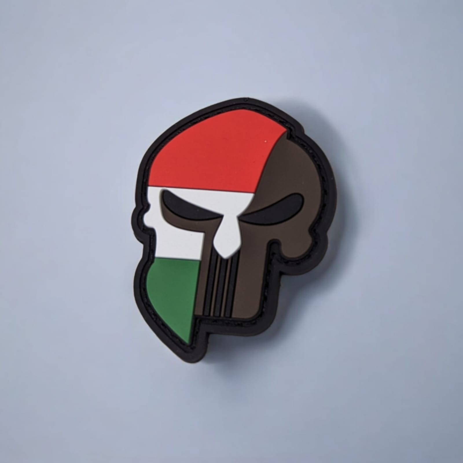 Patch din PVC de calitate Skull în culorile steagului HU. Potrivit pentru șepci, rucsacuri, jachete, hanorace sau alte echipamente cu panou velcro.