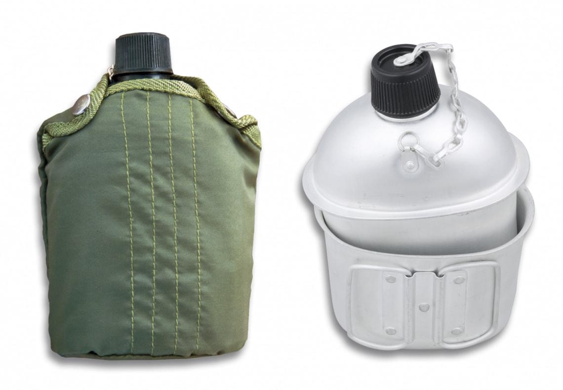 Klasická poľná fľaša s hrnčekom a púzdrom, ktoré sa dá upevniť na opasok.