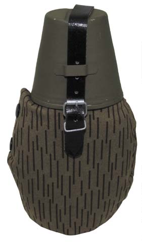 Vojenská poľná fľaša, využívaná v NVA (východonemecká armáda). Klasická ihličková maskovacia potlač. Fľaša obsahuje pohár.