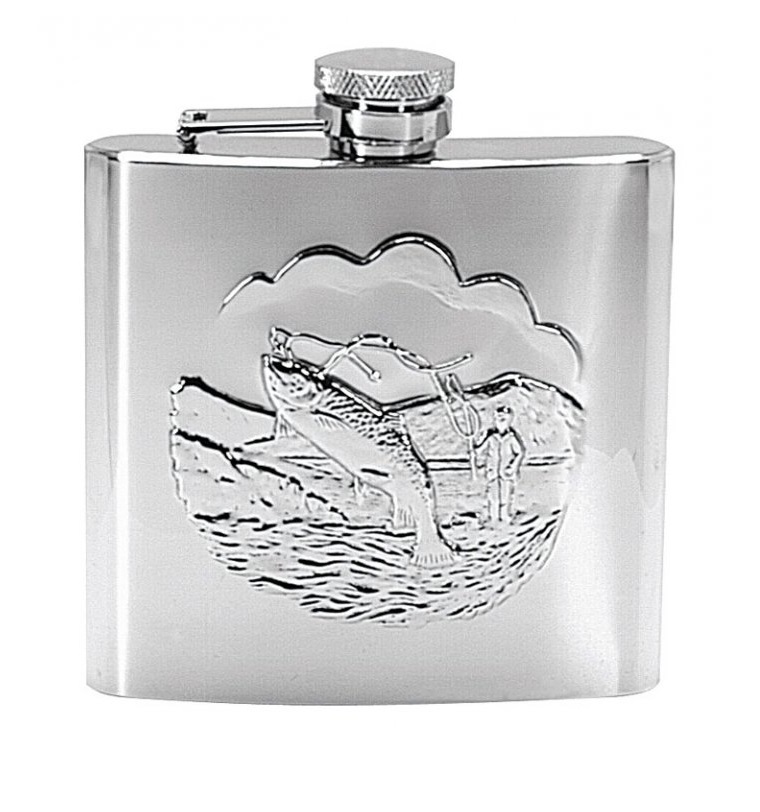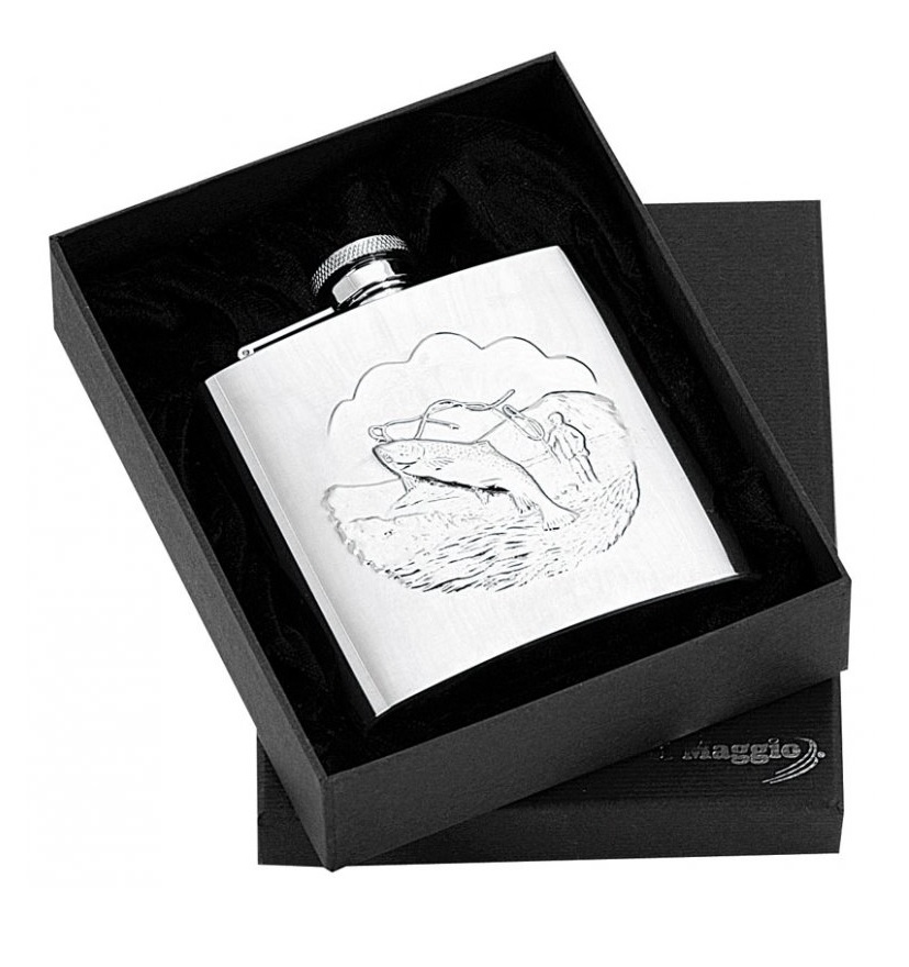Sticluță din oțel inoxidabil, decorată cu un motiv specific pescuitului.