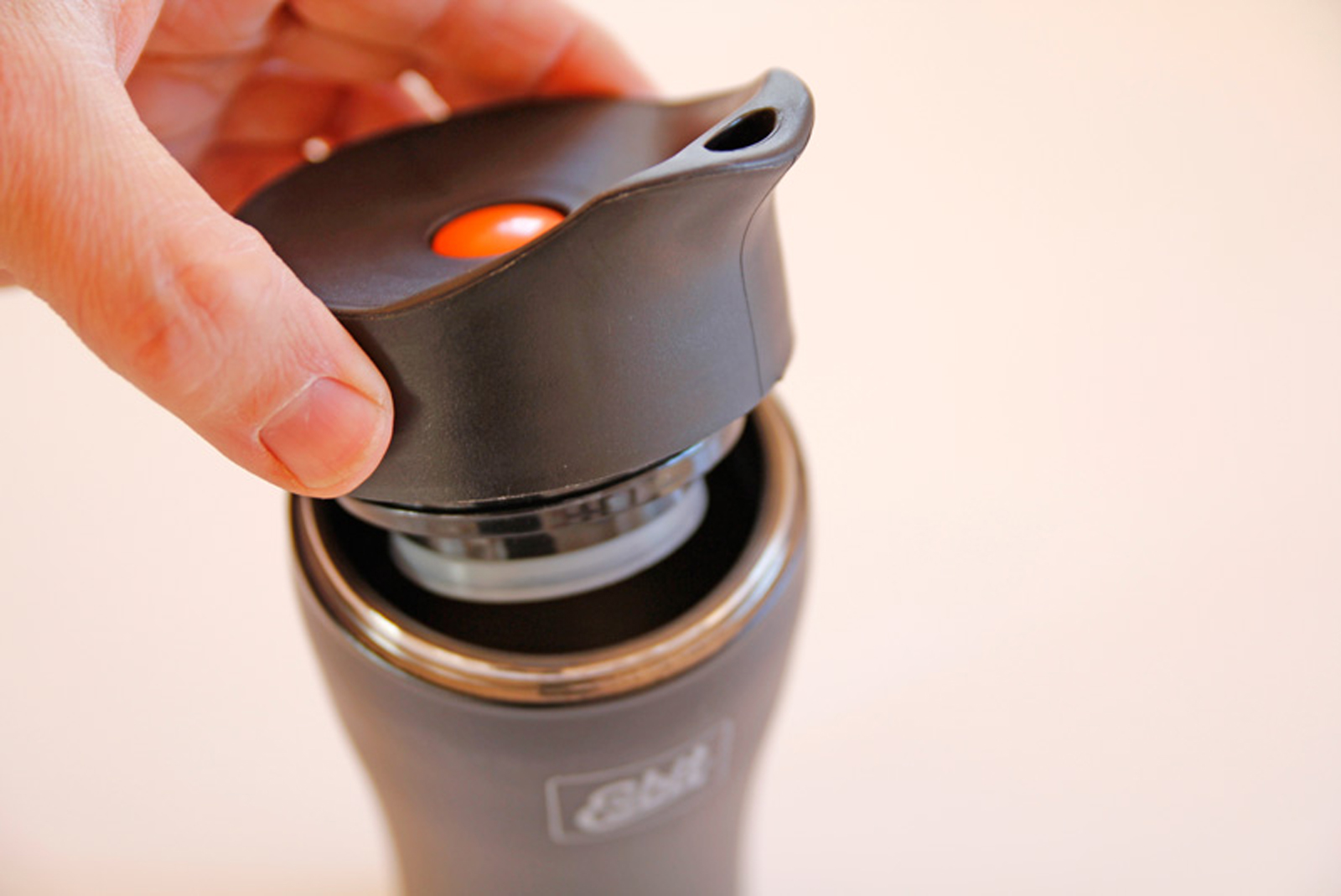 Puteți bea apăsând butonul portocaliu din mijlocul capacului.