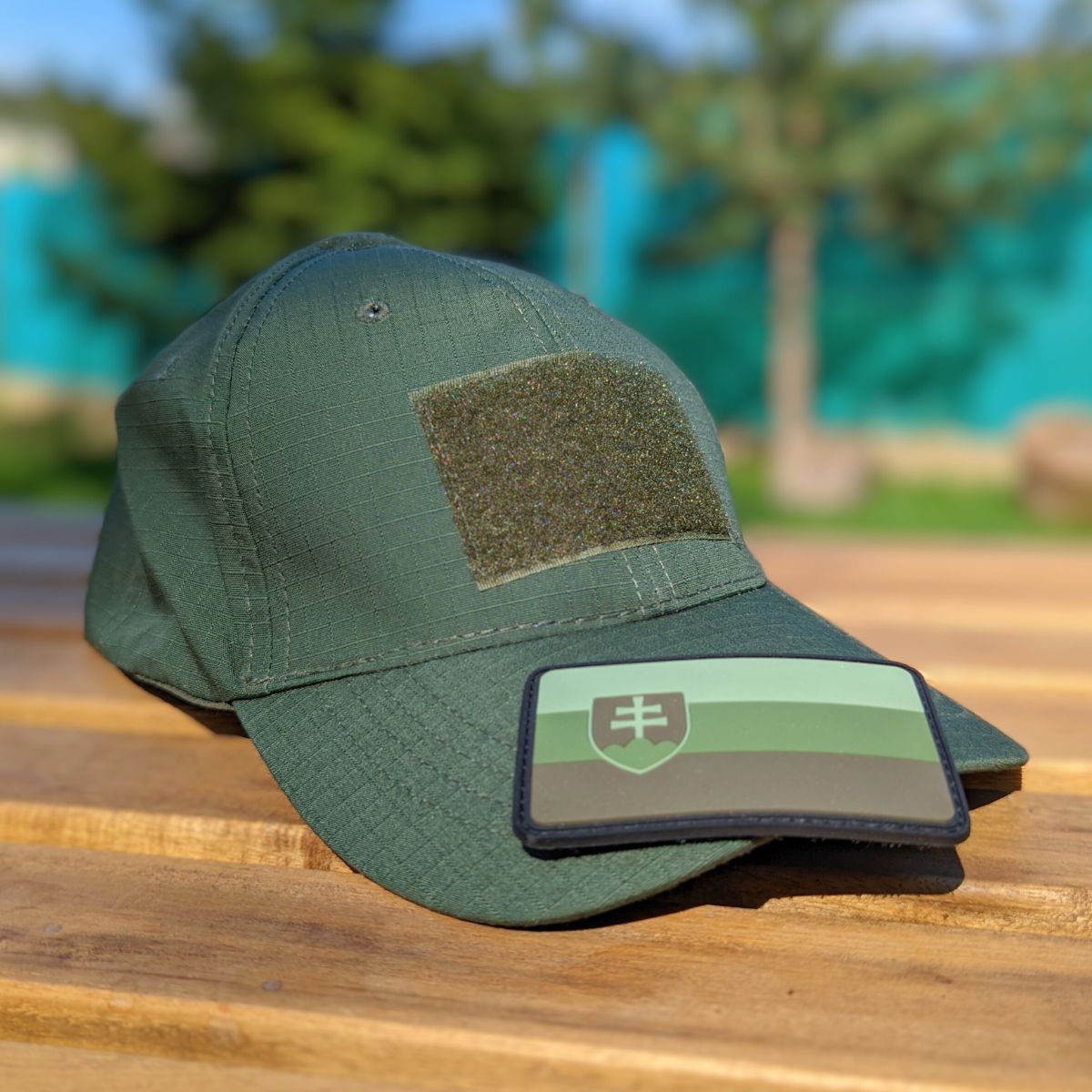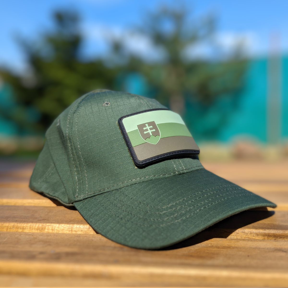 Șapcă tactică din material Rip/Stop, prevăzută cu 3 panouri velcro. Panoul principal, din partea frontală, include un patch detașabil cu steagul Republicii Slovace, realizat în culori adaptate echipamentului de camuflaj.