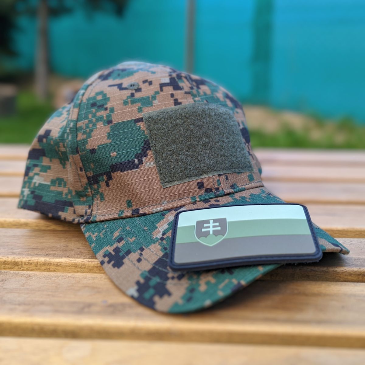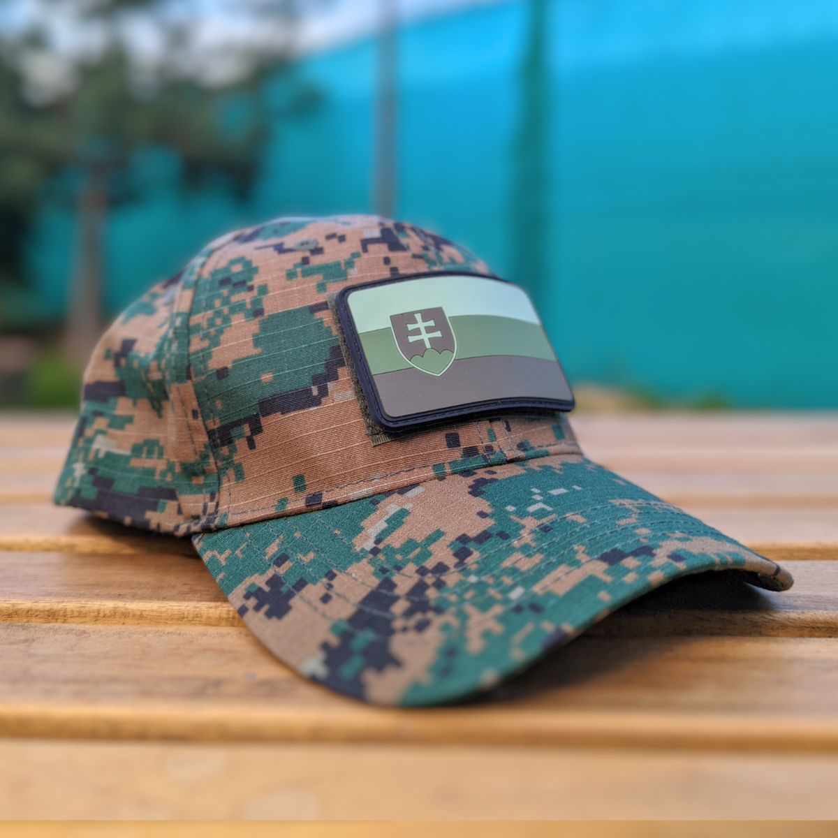 Șapcă tactică în design Rip/Stop cu 3 panouri velcro. Panoul principal din partea frontală dispune și de un patch detașabil cu steagul Republicii Slovace, care este conceput în culori potrivite pentru echipamentul de camuflaj în nuanțe de pădure.