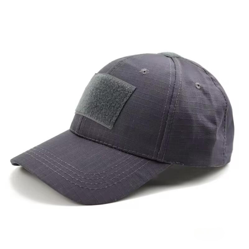 Șapcă tactică în design Rip/Stop cu 3 panouri velcro. Un alt panou velcro este un mic pătrat chiar în partea de sus a șepcii, iar ultimul este în spate, chiar deasupra sistemului de reglare a mărimii șepcii.
