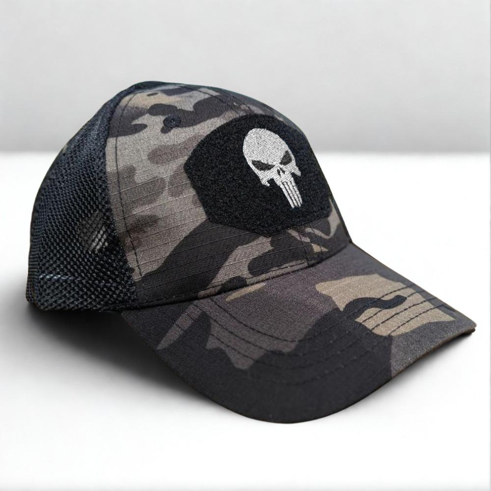 Șapcă tactică cu plasă pentru o mai bună respirabilitate în condiții tropicale. Include elemente tactice precum 3 panouri velcro și orificii de ventilație. Panoul velcro principal din față prezintă logo-ul Skull.