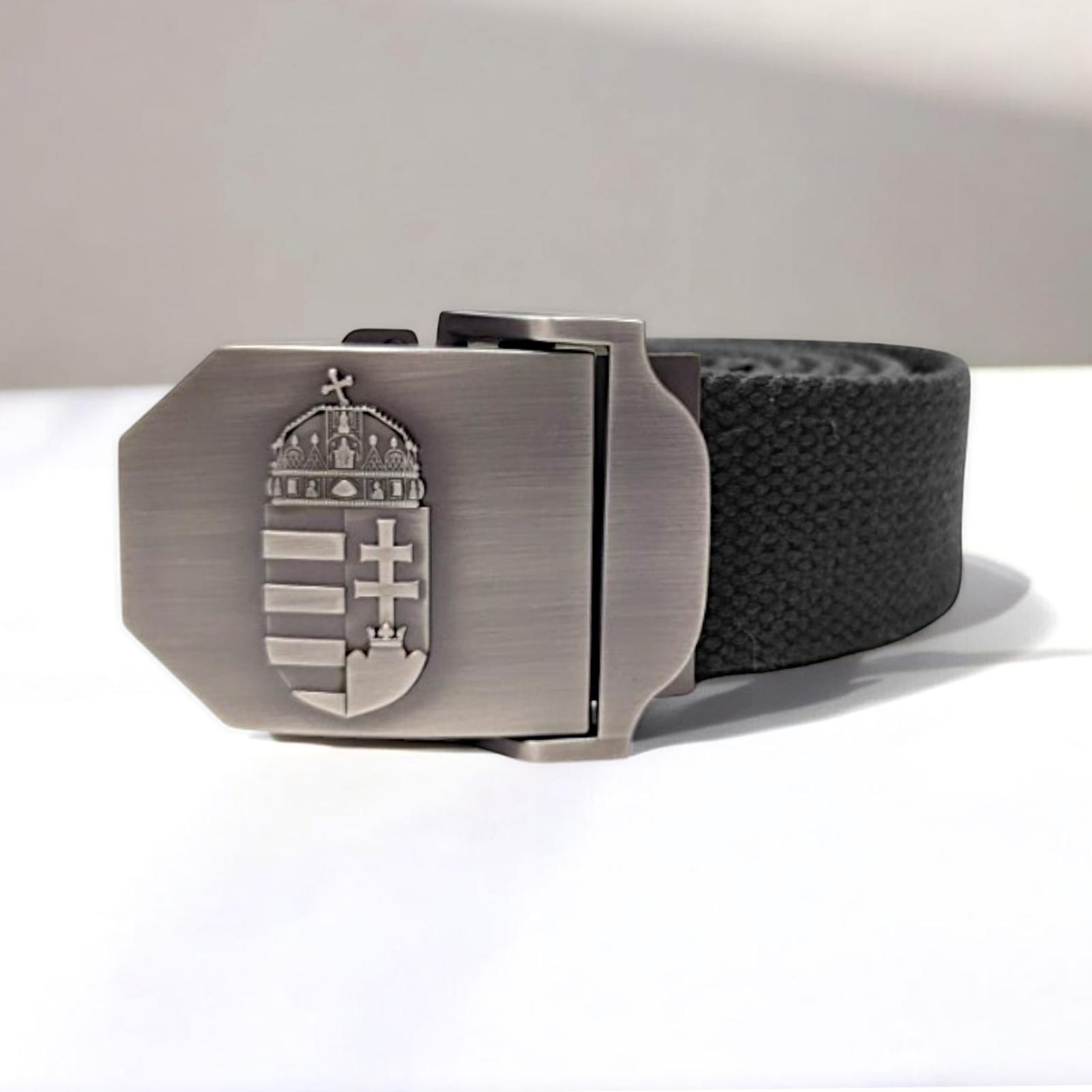 Curea cu cataramă metalică decorată cu un motiv al stemei Ungariei, reliefat în format 3D pe suprafața cataramei. Sistemul de închidere este rapid și simplu.