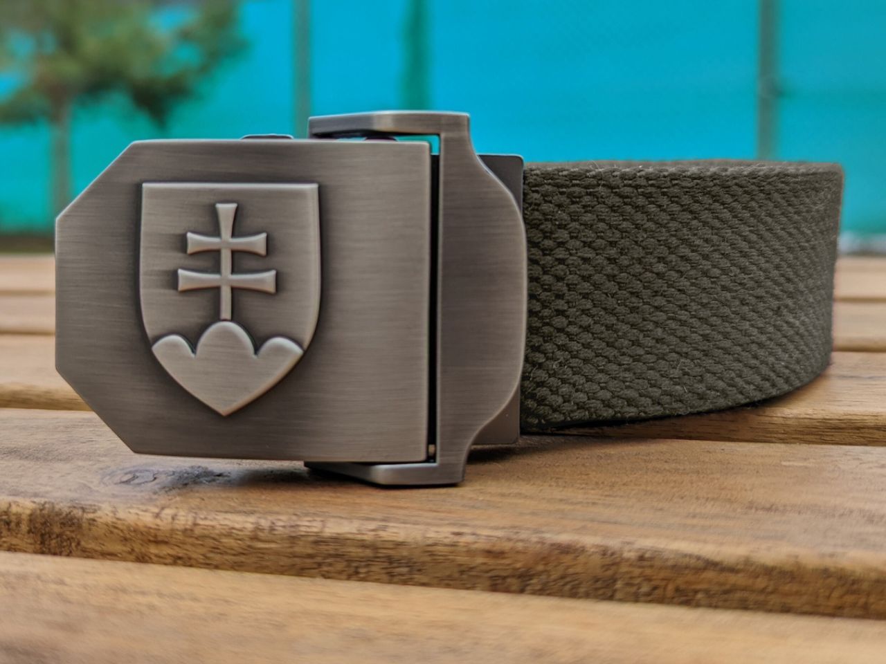Curea cu cataramă metalică decorată cu un motiv al stemei Slovaciei, realizat în relief 3D. Sistemul de închidere este rapid și simplu.