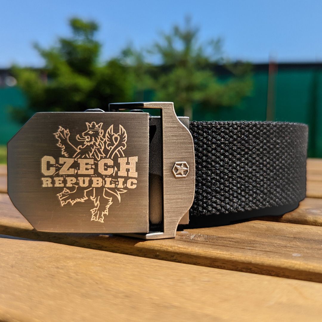 Opasok s kovovou prackou s motívom Českého znaku, ktorý je na kovovej pracke vygravírovaný. Systém zapínania je rýchly a jednoduchý.