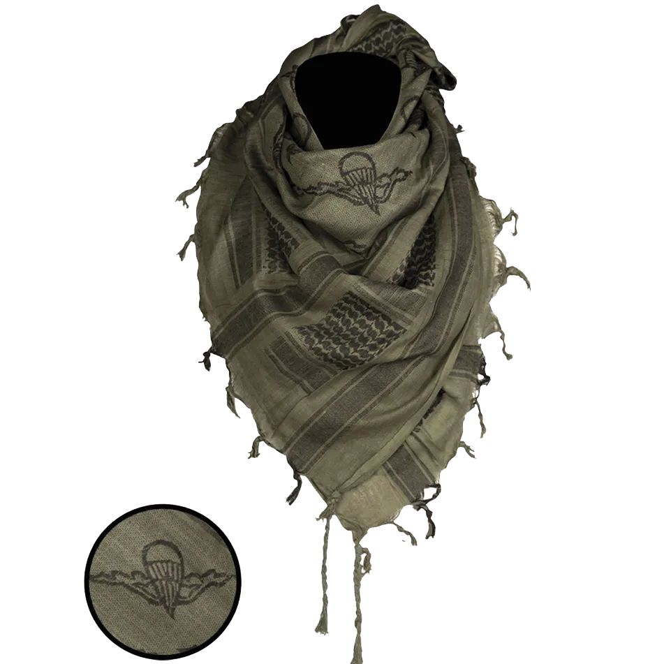 Eșarfă sau șal în stil arăbesc / shemag. Dimensiunile sunt 110 x 110 cm. Include și un mic logo Paratrooper (parașutiști).