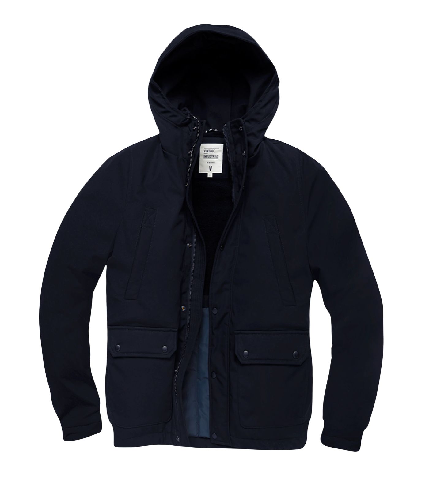 Geaca Vintage Industries Ledger. Este o geacă de iarnă în stil parka. Croiala este sub talie. Geaca are un fermoar metalic robust, care este acoperit suplimentar cu o clapetă cu capse. Gluga poate fi ajustată.