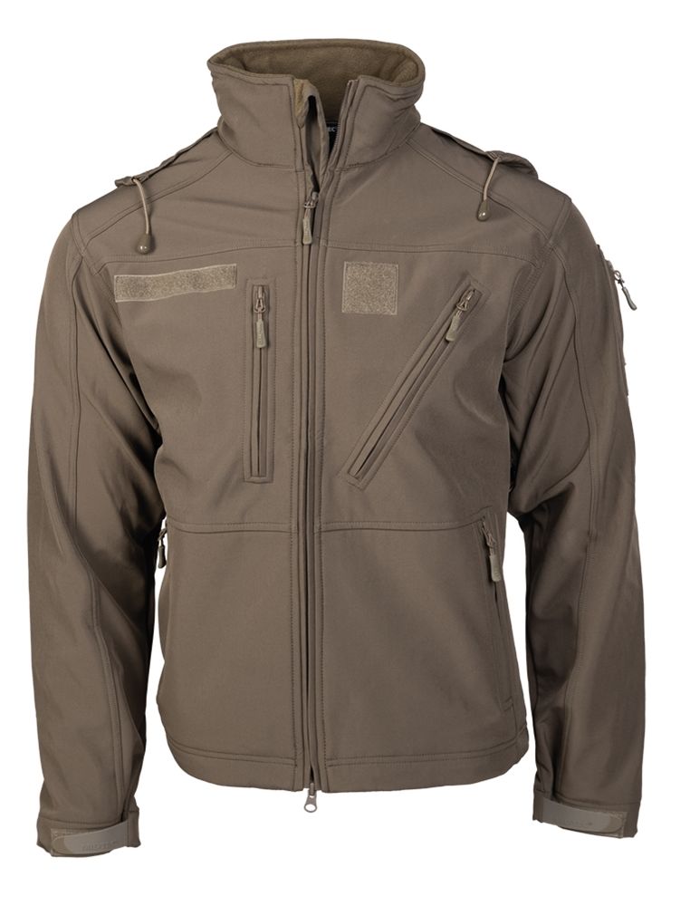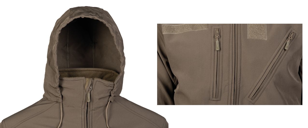 Geacă softshell pentru vreme mai rece, cu un material de suprafață foarte elastic. Geaca include și elemente tactice, cum ar fi panouri velcro, manșete ajustabile și buzunare amplasate inteligent. În guler se află o glugă cu manșete ajustabile.