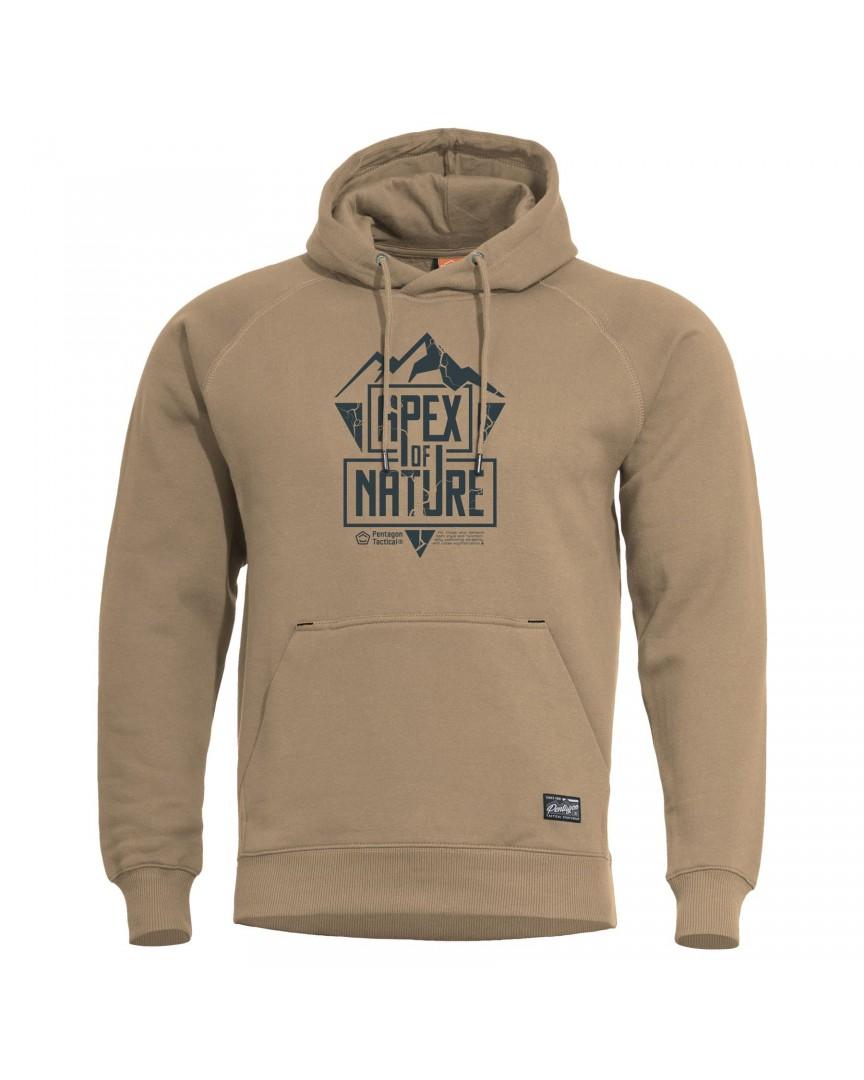 Hanorac Pentagon Phaeton Apex Of Nature cu glugă, care poate fi ajustată cu șnururi. Hanoracul nu are fermoar. Pe partea din față se află un buzunar spațios tip marsupiu. Acest model are pe piept inscripția Apex Of Nature.