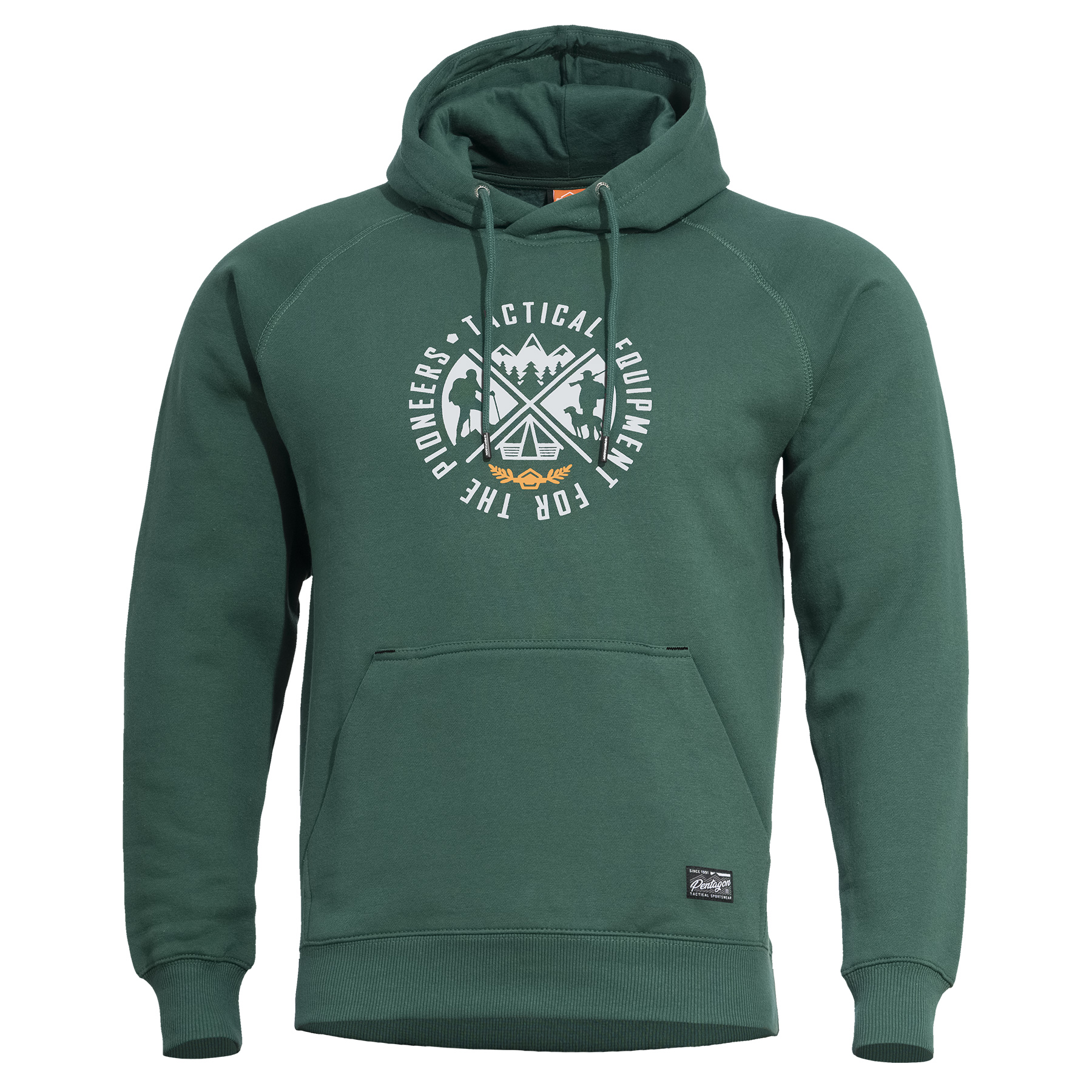 Hanoracul Pentagon Phaeton Pioneers cu glugă, care poate fi ajustată cu șnururi. Hanoracul nu are fermoar. Pe partea din față se află un buzunar spațios tip marsupiu.