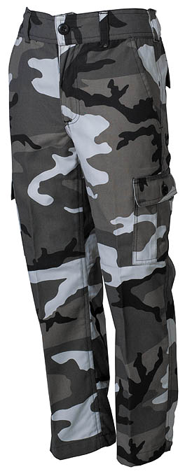 Pantaloni tip camuflaj pentru copii, în croială originală US Army BDU. Talie elastică. Dimensiunile din tabelul de mărimi sunt indicate în stare întinsă.