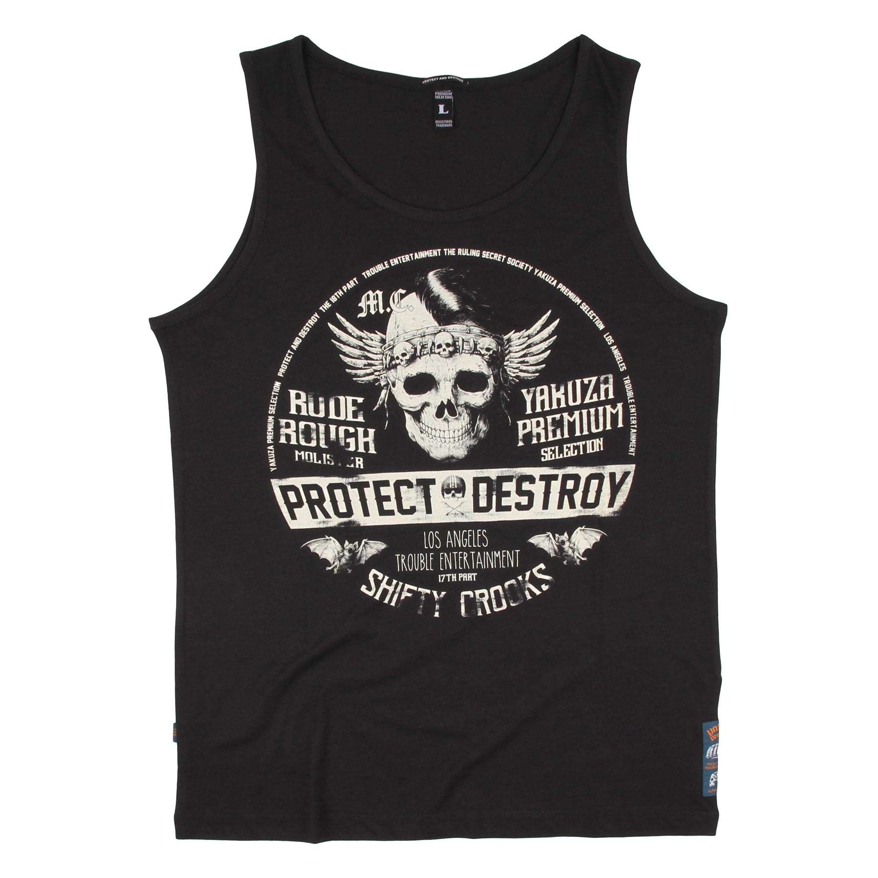 Tielko od populárnej streetewear značky Yakuza Premium. Protect and Destroy je tielko z kolekcie Jar/Leto 2021. Monochromatická potlač obsahuje potlač na chrbte aj na hrudi.