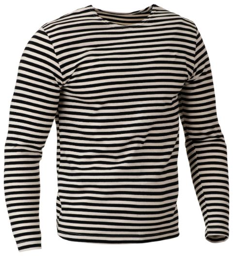 Tricou cu dungi și mânecă lungă. Acest tricou marinăresc are dungi de culoare neagră. Materialul este 100% bumbac, însă structura sa este realizată printr-un sistem de tricotare dublă, ceea ce crește durabilitatea acestui material.