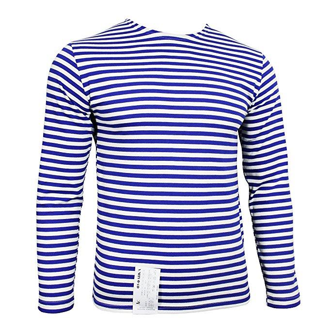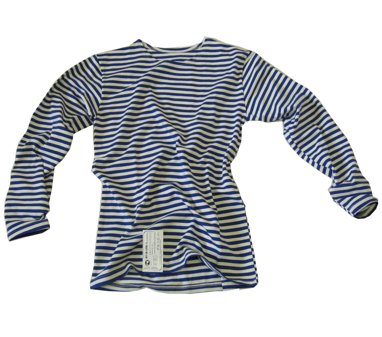 Tricou cu dungi și mâneci lungi. Acest tricou marinăresc are dungi de culoare albastru deschis. Materialul este 100% bumbac, însă structura sa este realizată printr-un sistem de tricotare dublă, ceea ce crește durabilitatea acestui material.