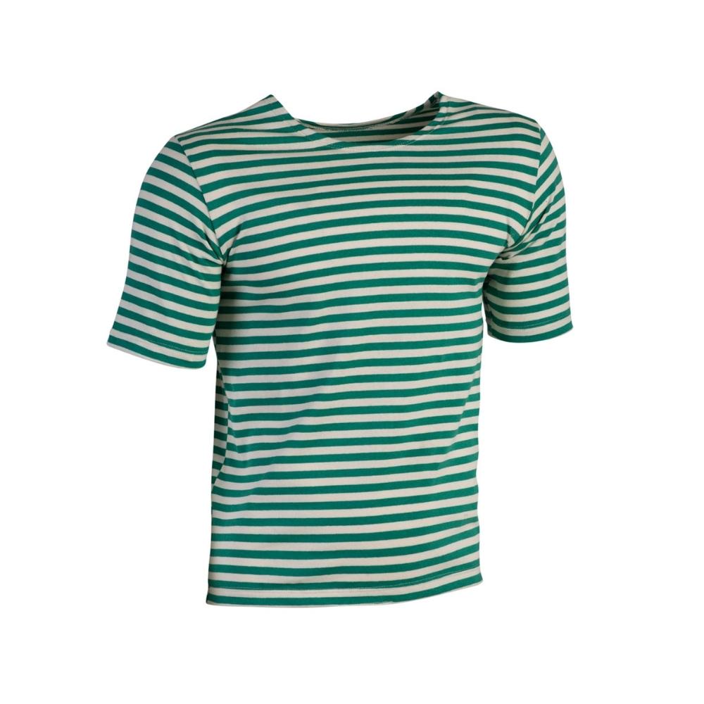 Tricou cu dungi, model POG, care are dungi de culoare verde. Sistemul de țesătură dublă asigură o rezistență mai mare a materialului.