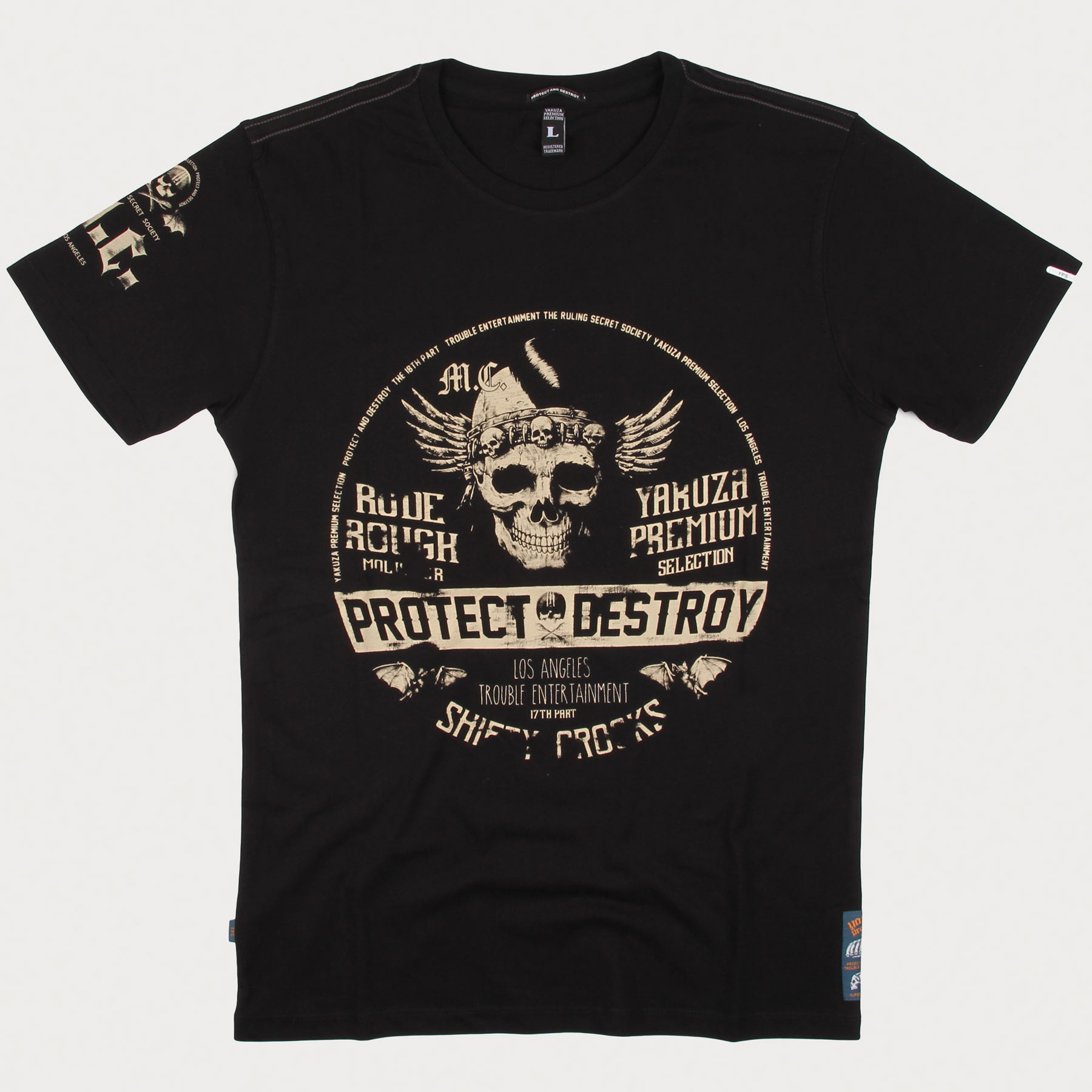 Tričko od populárnej streetewear značky Yakuza Premium. Protect and Destroy je tričko z kolekcie Jar/Leto 2021. Monochromatická potlač obsahuje potlač na chrbte aj na hrudi.