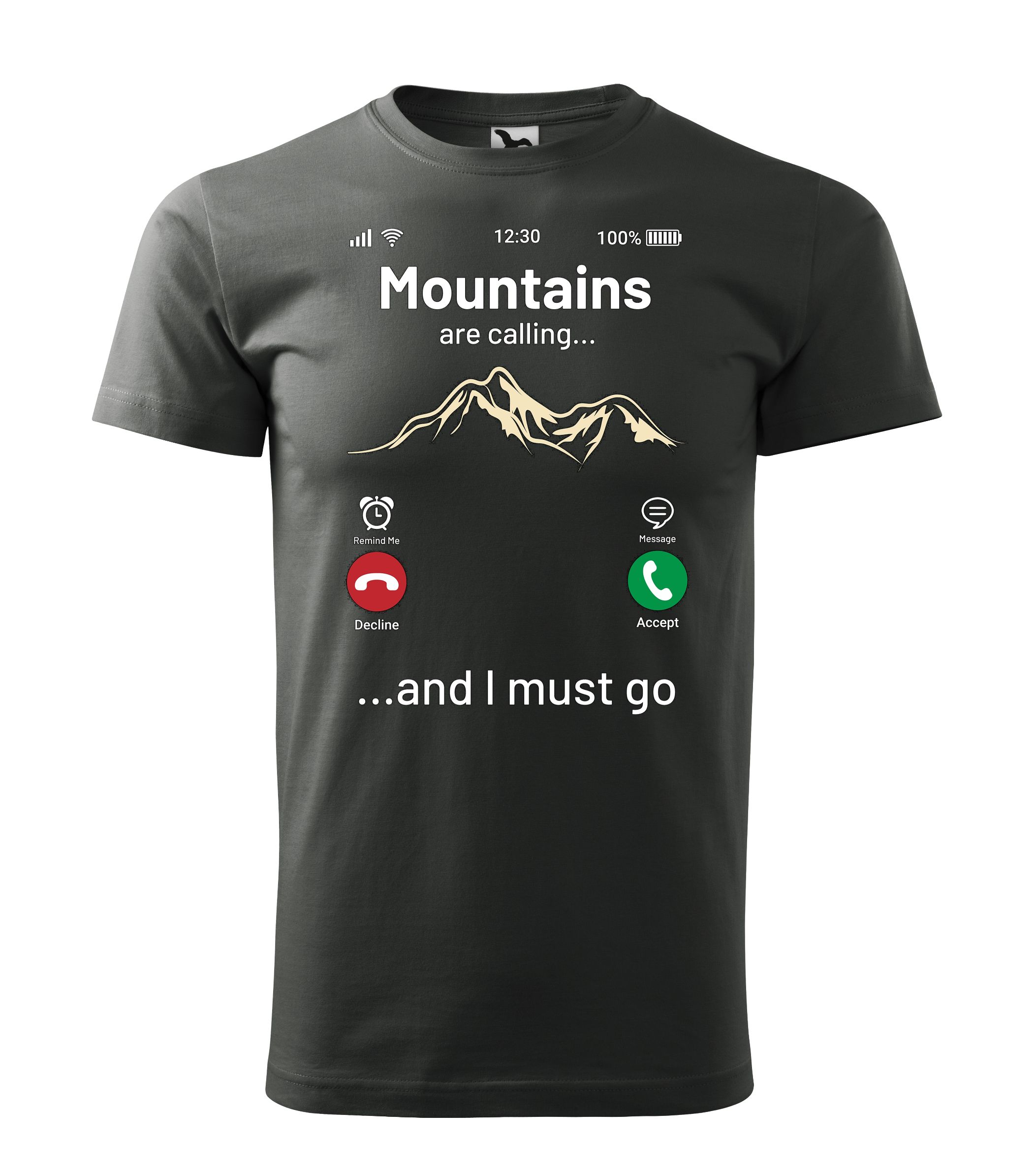 Tricou cu un motiv creativ care ilustrează ecranul unui smartphone, pe care apare un apel primit - Mountains are calling ... and I must Go. Adică în traducere - Munții mă cheamă și trebuie să plec.