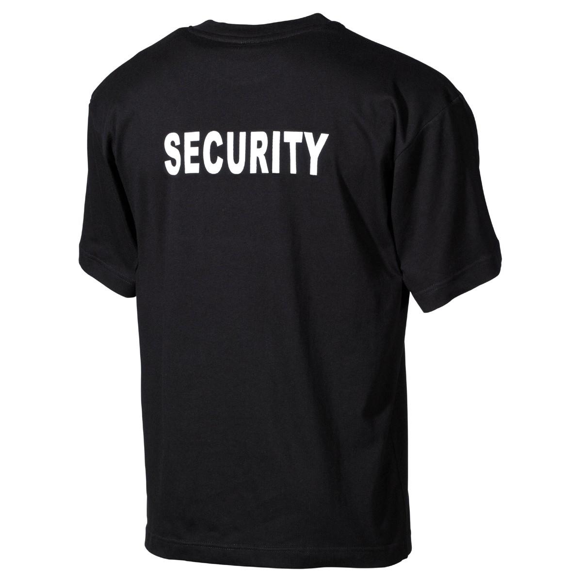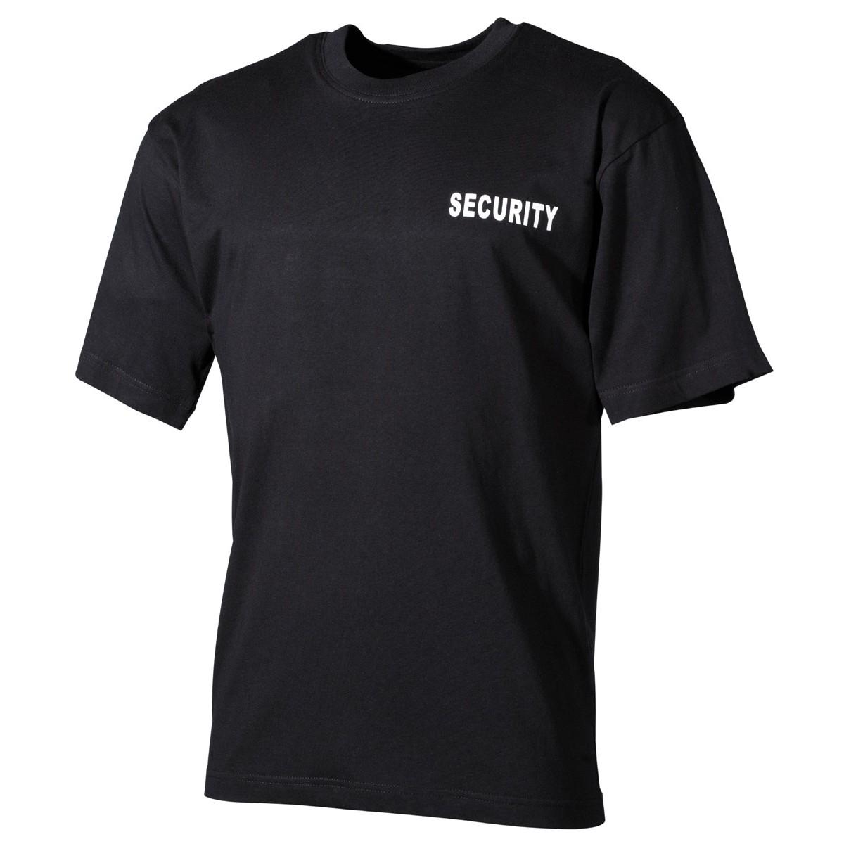 Tricou din bumbac Security, de culoare neagră clasică. Inscripția este pe partea din față, în stânga, pe piept. Pe partea din spate se află o inscripție mai mare și mai vizibilă SECURITY.